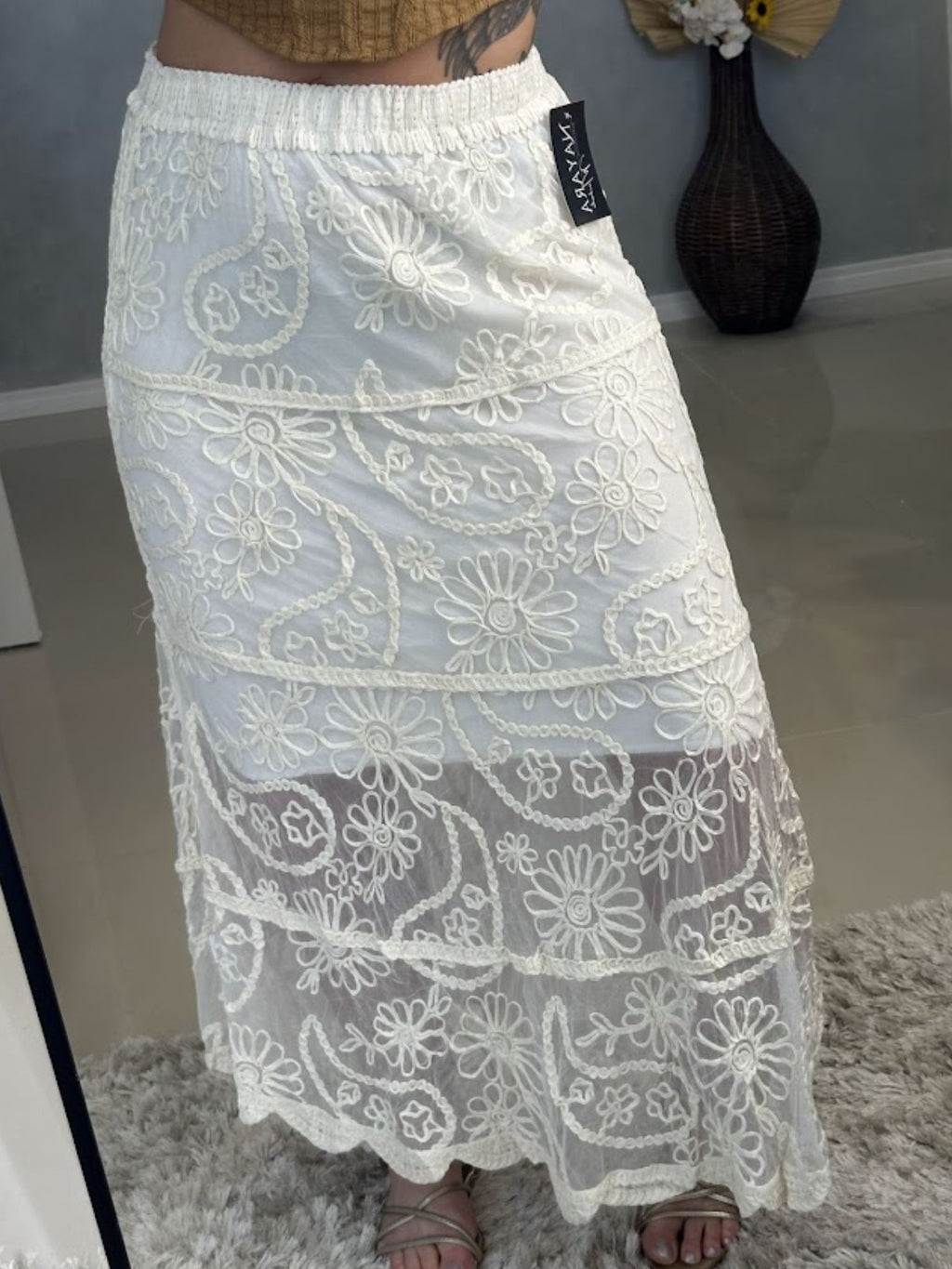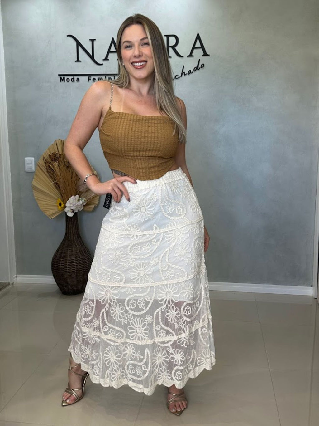 A Saia Midi com Crochê e Tule de Elastano é a peça perfeita para quem busca charme, textura e movimento em um único look.
