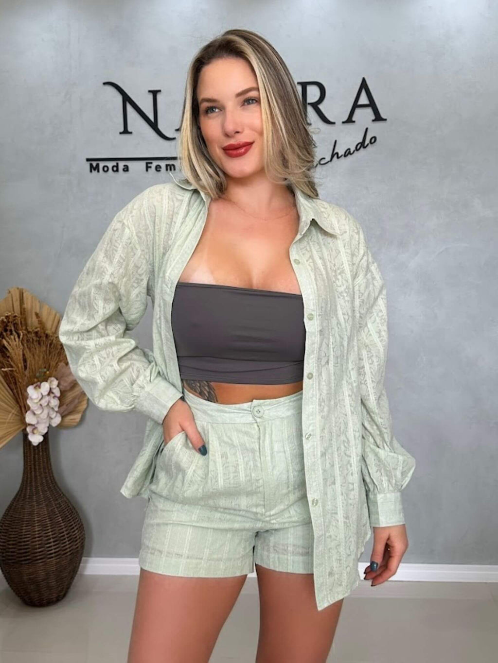 O Conjunto Feminino Camisa & Short traduz frescor e elegante em uma proposta única. Produzido em alfaiataria texturizada, o tecido traz desenhos delicados em sua trama que refletem o espírito da primavera. Com caimento leve e modelagem confortável, está disponível em quatro núcleos versáteis e tamanhos do P ao G. Uma escolha charmosa e prática para compor produções modernas e sofisticadas na estação mais florida do ano.