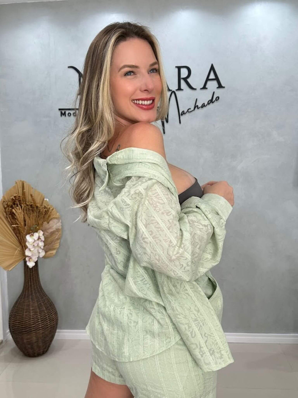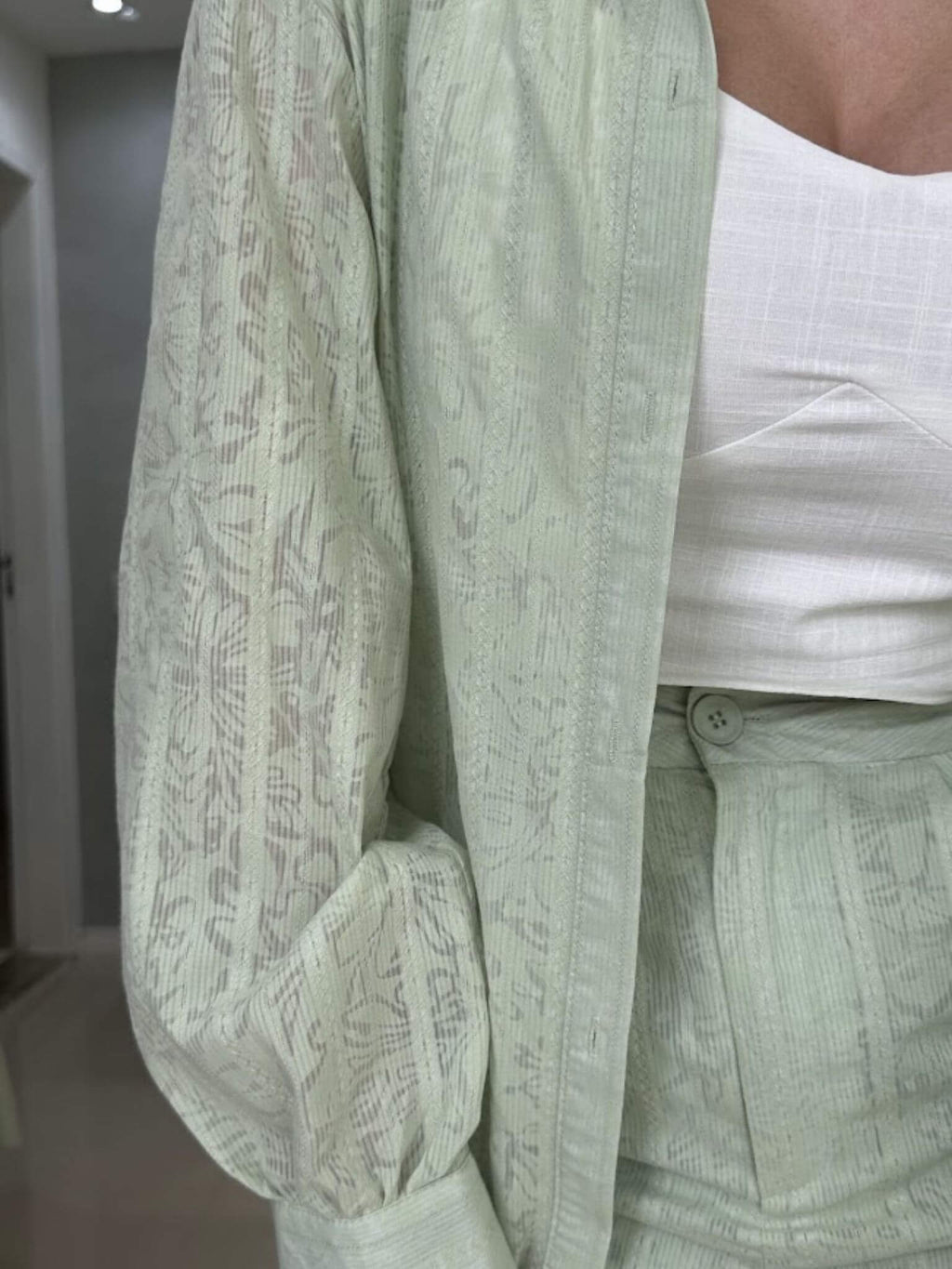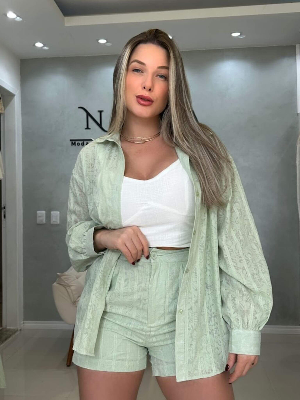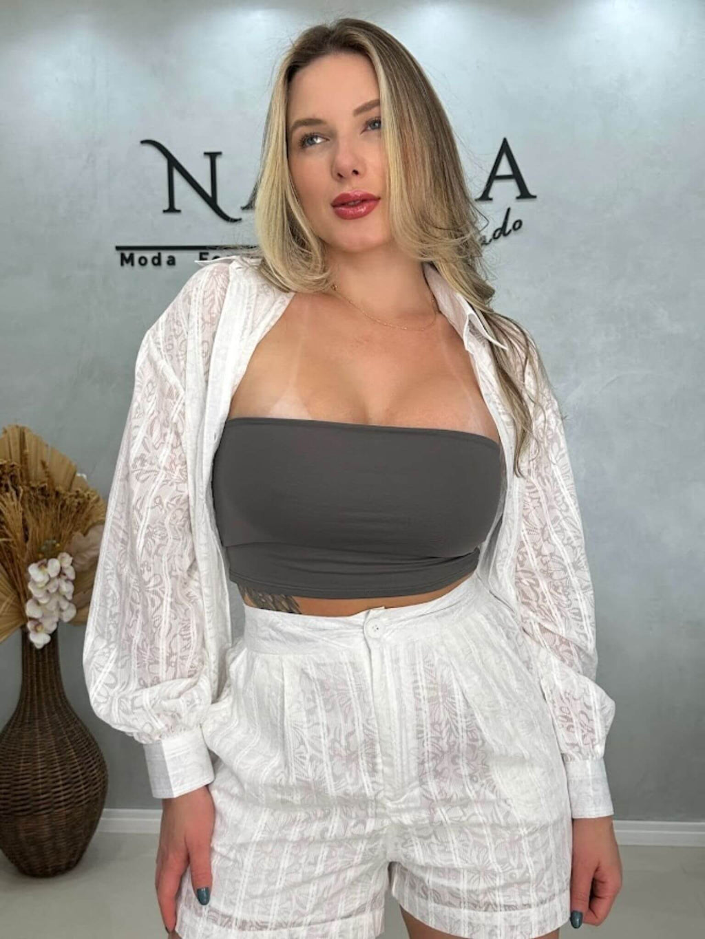 - camisa e short com trama toda trabalhada, cheia de detalhes que encantam;